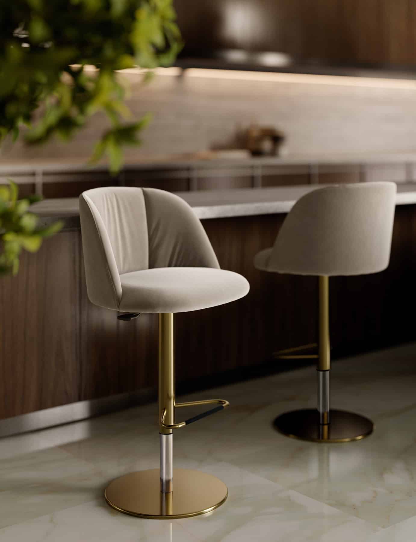styles. Its round swivel base and adjustable height, complete with a footrest, exude elegance in both residential and contract environments. The distinct vertical quilting on the upholstered back not only creates a striking graphic pattern but also enhances the seat’s ergonomic comfort.