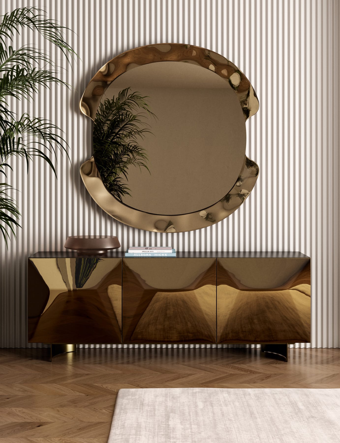 Though characterized by a classic and functional design, the Eden sideboard stands out as a unique blend of technological innovation and material craftsmanship. Its mirrored, smoked, or bronze doors serve as captivating aesthetic highlights. The meticulous manufacturing process, marked by a linear yet sharp silhouette, captivates the viewer across its entire surface, transforming dynamically with variations in light and the observer’s perspective, creating mesmerizing iridescent plays of light and shadow.