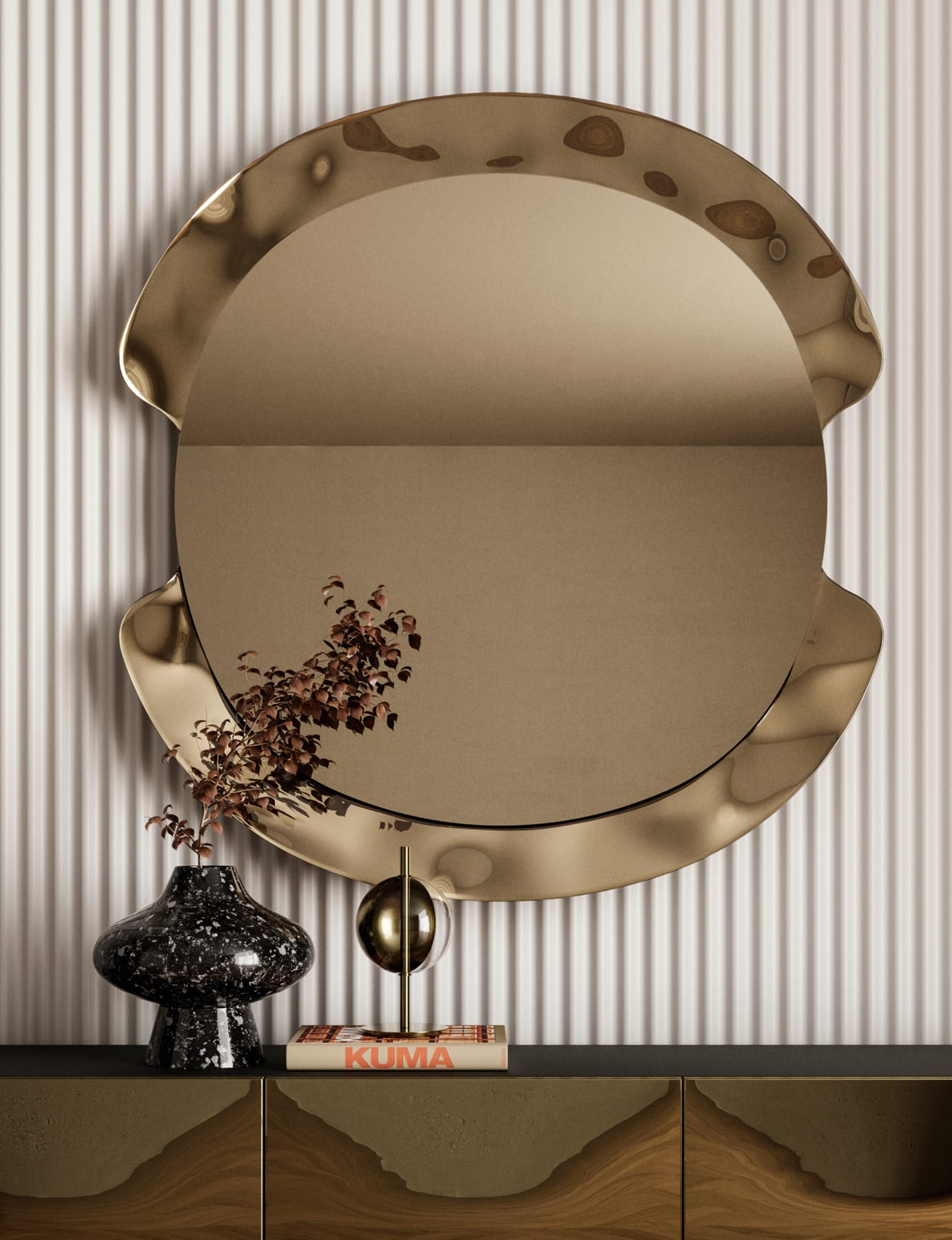 The Peak mirror features a striking curved profile crafted from mirroring glass with gentle angles, elegantly framing its line. This design not only enhances the reflection of light but also creates a mesmerizing three-dimensional perspective, leaving a lasting visual impression. Peak represents an elegant creative endeavor, resulting in a visually light and harmonious object that exudes solemn simplicity.