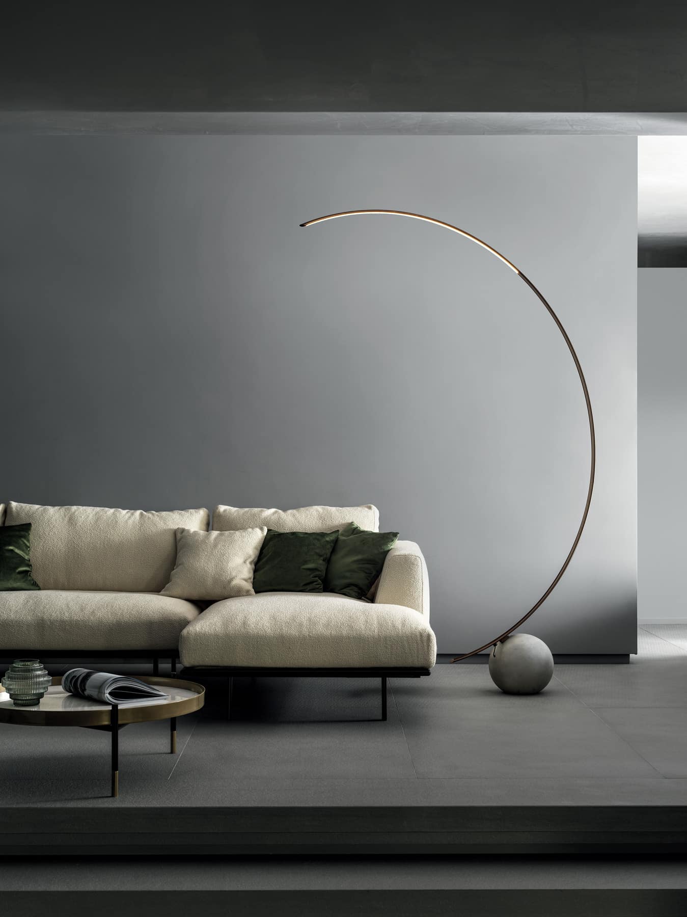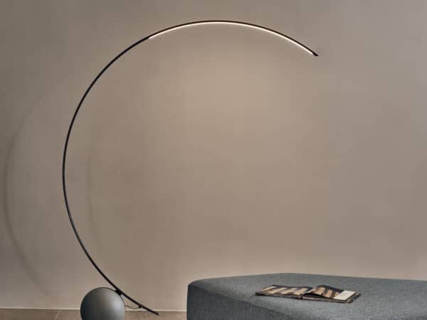 Introducing the Circle Lamp: where a metal arch seamlessly merges into a concrete ball, creating a stunning piece of art that blends the distinctive style of a floor lamp with the elegance of a precious sculpture.