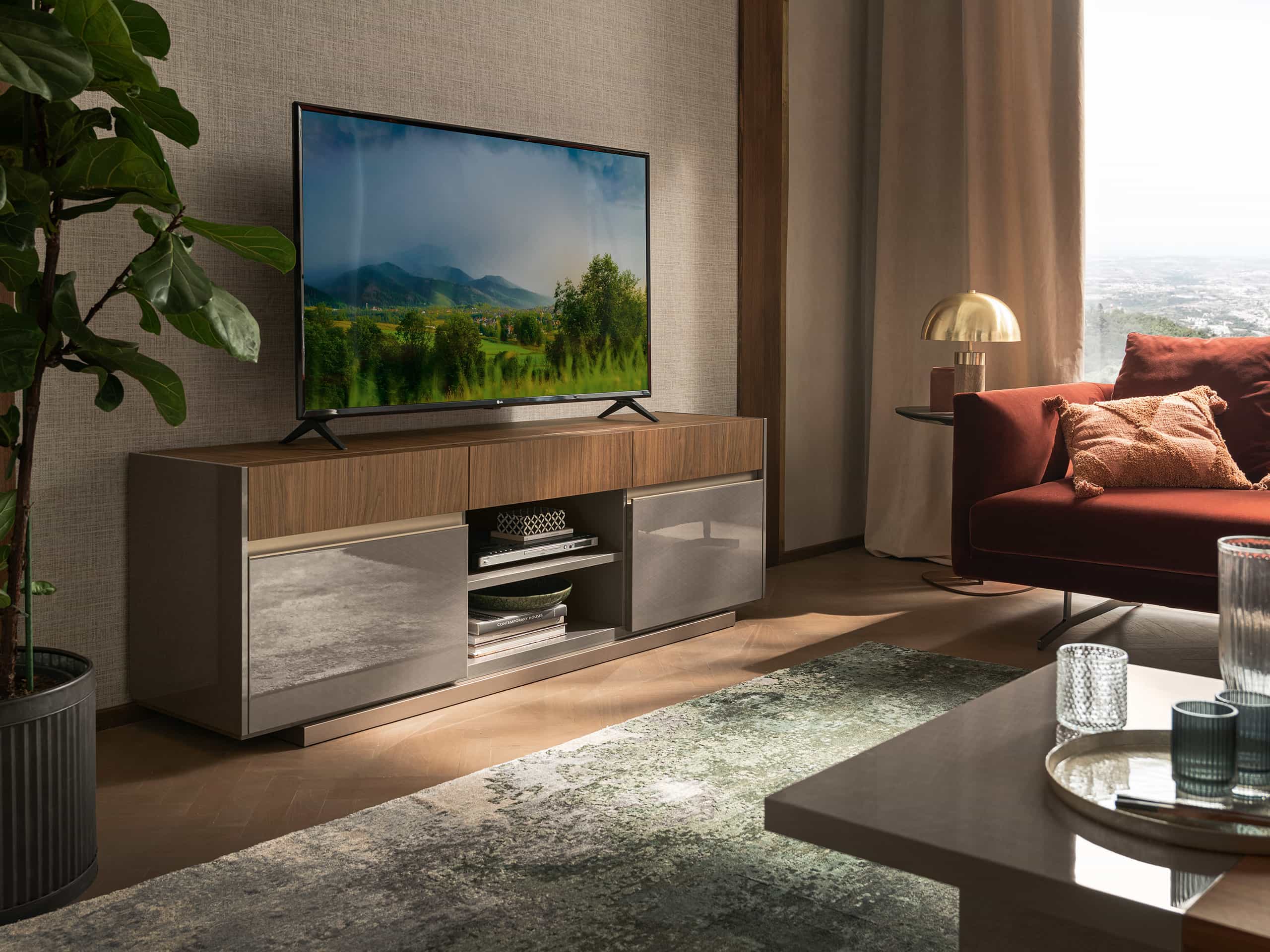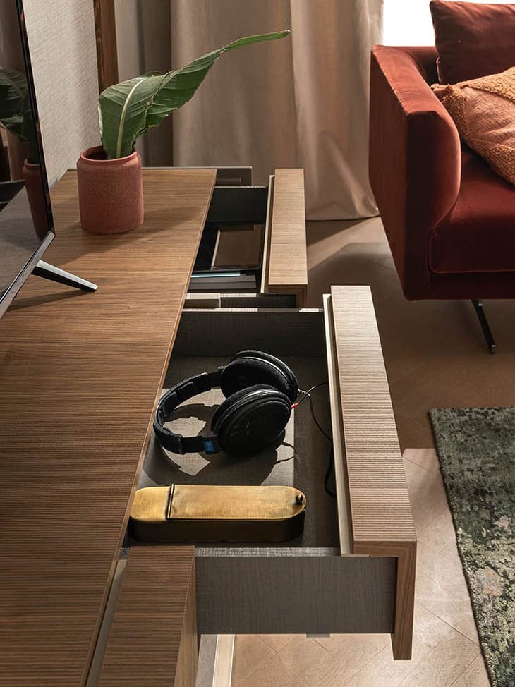 The Corso Como Entertainment Center by ALF Italia offers an elegant TV storage unit wrapped in sophisticated Italian design. Featuring a laser-etched decorative motif across the Canaletto Walnut veneer, this TV unit/entertainment center combines textural depth with visual warmth. Soft-close drawer slides ensure quiet functionality, while the clean silhouette and Italian craftsmanship make it a standout piece in any modern living room.