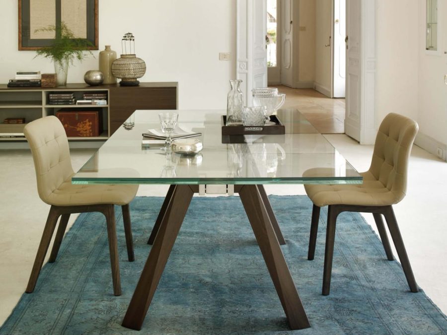 The extendable Aron Dining Table with wood or lacquered wood frame. The top and extensions are made of glass.