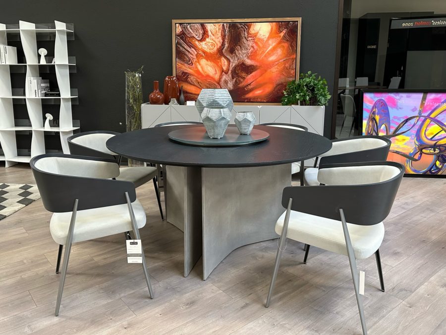 Magnum Round Table by Bontempi Casa is a striking fusion of monolithic form and dynamic visual lightness. Designed by combining two concrete elements into a unified sculptural silhouette, the table transforms as you move around it—creating an expressive, emotional presence that enhances any modern interior without compromising functionality. As pictured, the Magnum fixed round table features an Anthracite concrete base paired with a Charcoal Oak Veneer top. This model is sold with an optional Lazy Susan in Anthracite Lacquered Glass for an elevated dining experience.