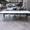 The Bontempi Mirage table is an extendable table with a lacquered aluminum frame and a top made of SuperMarble. The table has a simple structure with a square or rectangular top and four sleek metal legs with diamond-cut faceting details for a geometric touch. The legs are aesthetically pleasing and offer sturdy support and plenty of legroom.