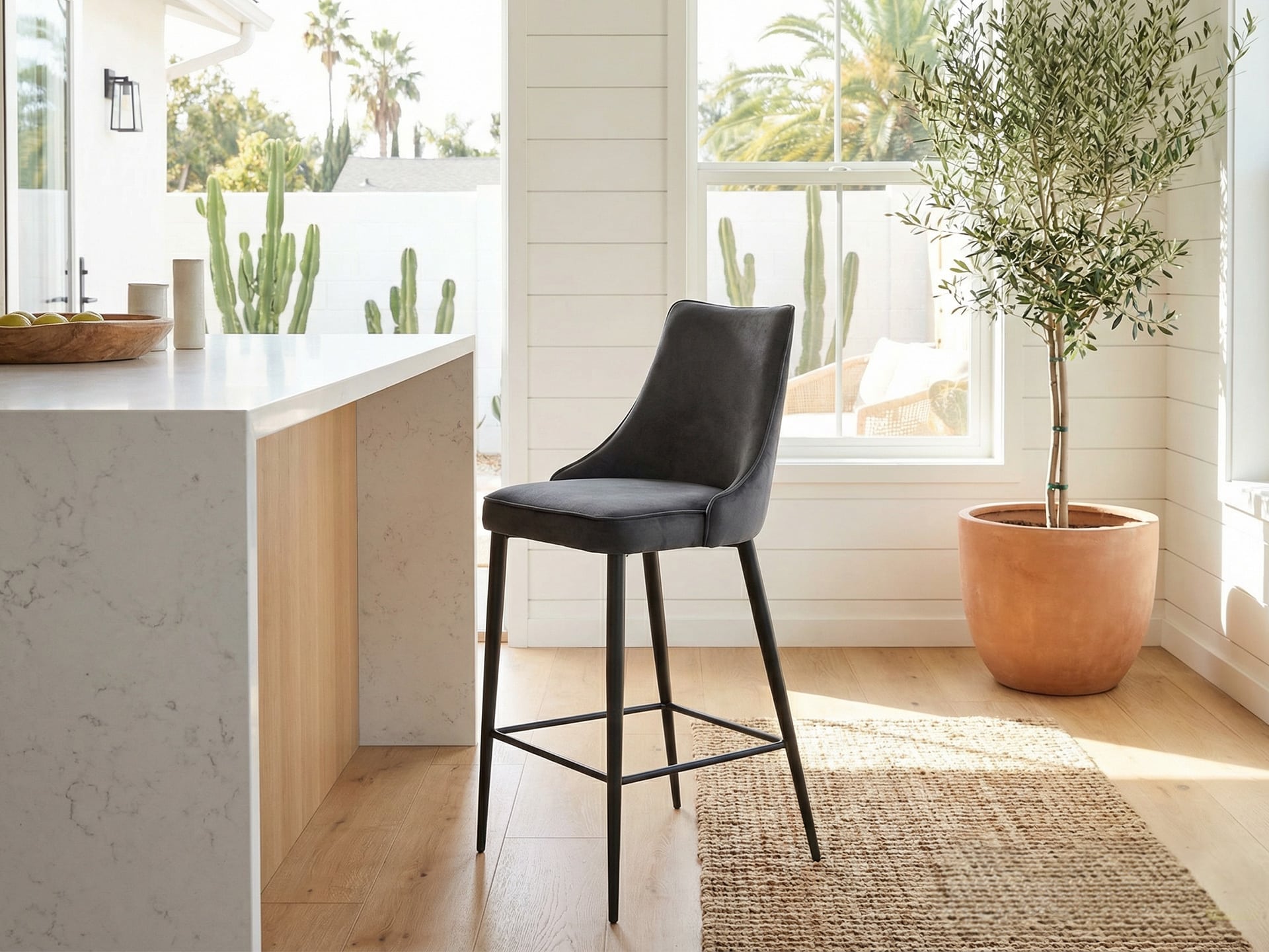 Clara Barstool by Bontempi Casa features cozy, inviting shapes that echo refined retro design while offering modern comfort. Its sleek metal frame in Anthracite (M310) pairs beautifully with the upholstered seat and cord cover in Waterproof Nabuk Anthracite (TN007T), creating a sophisticated monochromatic look suited for contemporary kitchens, bars, and social spaces.