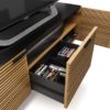 CORRIDOR 8177 is three compartments wide. The center drawer pulls out to reveal a full-width soundbar speaker shelf and a media storage drawer.