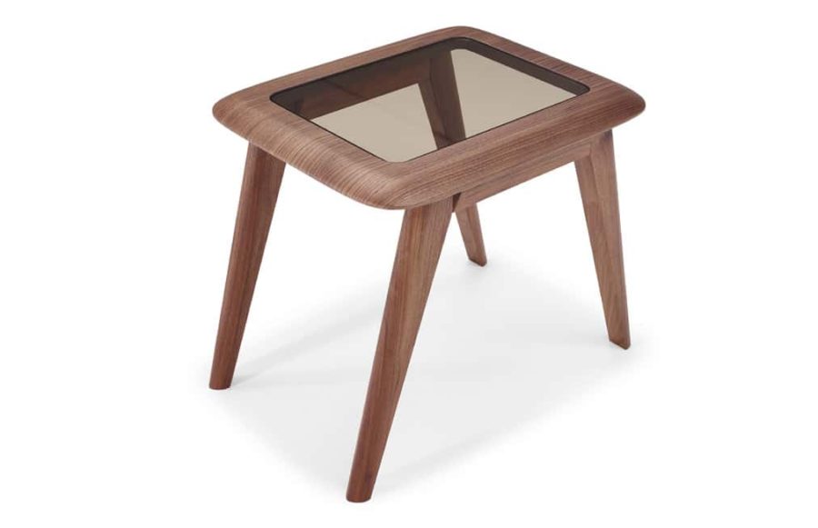 The Chianti rectangular accent table by Natuzzi Editions has a walnut wood veneer tabletop edge with tempered glass in the middle. The tabletops are made with a special technology that fits wood veneer to the convex surface of the floor, resulting in a flawless perception of solid wood. The legs of Chianti table are also finished with wood veneer and are tapered.