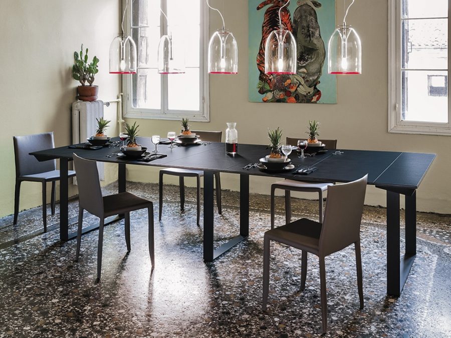 A perfect match for lofts, small-space dwellings, and floor plans where entertaining areas overlap, the Party Console/Dining Extension Table expands and contracts according to your needs. The laminated wood or walnut console top converts into a dining table with the addition of one or several leaves that can be added depending on the size of your party. Angular steel legs with embossed lacquered or satin stainless finish support the wood top, echoing the top’s angles and penchant for clean, architectural lines.