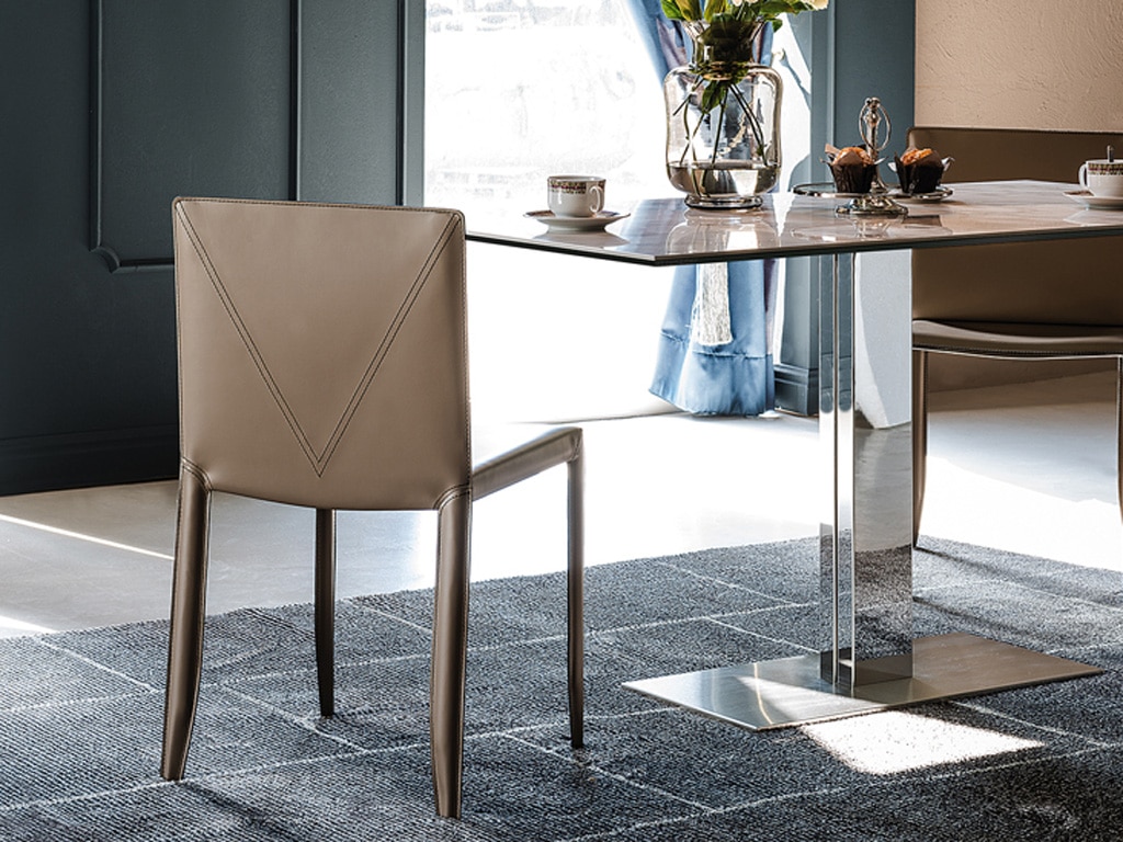 Ultralight chair with or without arms and steel frame covered in leather as per sample card. Standard stitching.