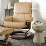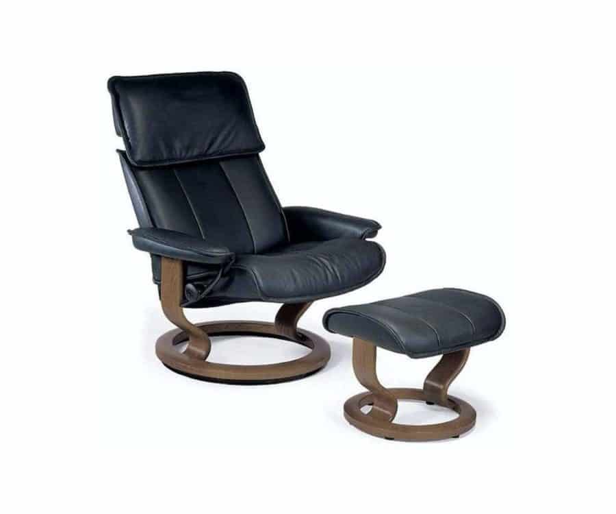 Stressless® Admiral is available only in Paloma grade leather, with seven colors at a reduced “Admiral Specials” price: Chocolate, Light Grey, Mushroom, New Cognac, Oxford Blue, Sand & Silver Grey.